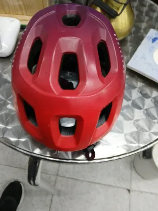 Casco de bicicleta con un diseño degradado de color rojo a morado. - Marca: Rockrider - Diseño ventilado