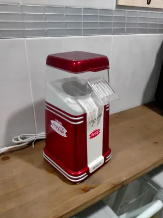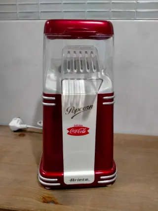 Palomitero Ariete con diseño retro inspirado en Coca-Cola. - Color rojo brillante. - Acabados plateados. - Incluye tapa transparente. - Únicamente usado para probarlo. - No conservo la caja.