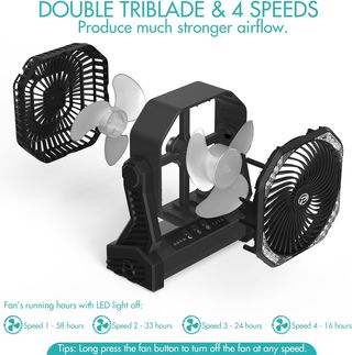 Nuevo sin estrenar. Ventilador de Acampar Portátil con Linterna LED, 8" Ventilador USB Recargable de 20.000mAh 270° Pivote 4 Velocidades Ventilador de Escritorio Personal. Cargar completa en 8-9 horas, entrada de 5V3A con cable USB-C, proporciona de 8-100 horas. Puerto de entrada/salida tipo C de 5V/3A, puerto de salida USB de 5V/2A, para cargarlo o utilizarlo como una batería para alimentar otros dispositivos. LUZ LED, de 16 cuentas con 3 ajustes de brillo. Doble hélice. 4 indicadores de velocidad y 4 indicadores de nivel de batería. Material ABS resistente y duradero para el uso anti-caída y collision. Gancho para colgar 1265