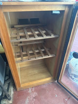 Bonita nevera para vinos, de madera. Ideal para conservar tus vinos favoritos a la temperatura perfecta. - Estructura de madera. - Dos estantes de madera para botellas. - Diseño elegante y compacto.