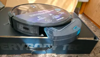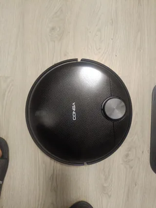 Robot aspirador de diseño moderno y funcional. Su acabado en color negro le da un toque elegante. - Base de carga con diseño acanalado. - Superficie de apoyo texturizada. Funciona muy pero le falta los dos cepillos de abajo. Y el resto está súper bien.