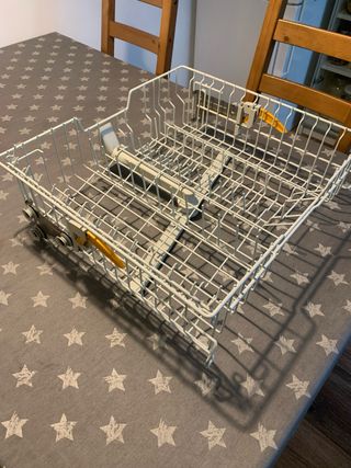 Cesta superior de repuesto para lavavajillas Miele. Fabricada en metal blanco con detalles en amarillo. - Diseño de alambre. - Ruedas integradas para facilitar el deslizamiento.