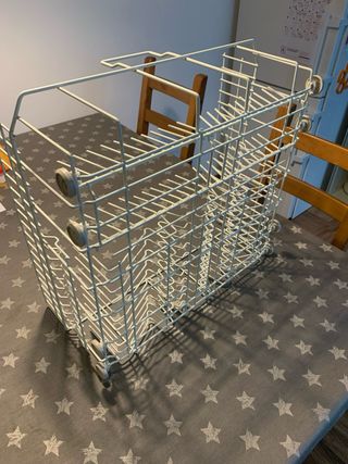Cesta inferior de repuesto para lavavajillas Miele. Fabricada en metal blanco con ruedas para facilitar su extracción. - Compatible con modelos Miele. - Diseño de rejilla para optimizar el lavado. - Ruedas integradas para un deslizamiento suave.