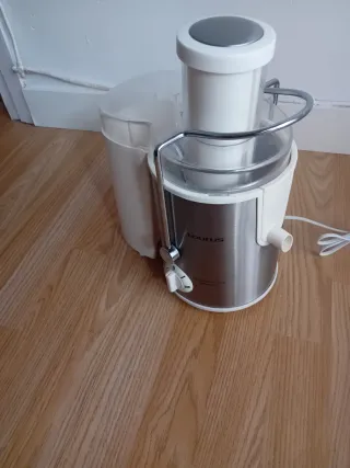 Licuadora de la marca Taurus con un diseño moderno y funcional. Ideal para preparar zumos y batidos. - Cuerpo principal en acero inoxidable y plástico blanco. - Jarra de plástico transparente. - Boca de alimentación amplia. - Palanca de control. - Asa de seguridad.