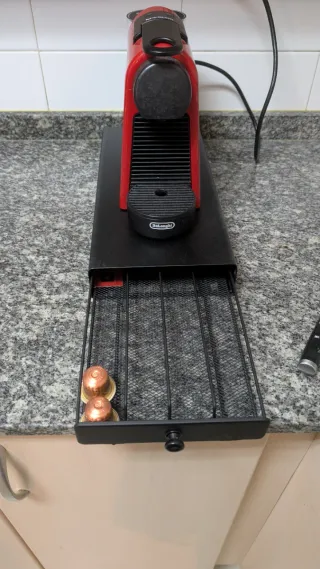 Cafetera Nespresso DeLongui Essenza Min de color rojo, ideal para preparar tu café favorito, en perfecto estado, poco uso. - Diseño compacto y moderno. - Bandeja recogegotas extraíble. - Incluye cajón para guardar capsulas