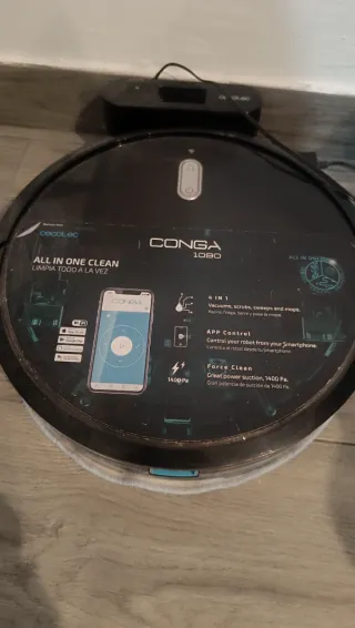 Robot aspirador Conga 1090, ideal para mantener tu hogar limpio. - Función 4 en 1: aspira, friega, barre y pasa la mopa. - Control mediante app desde tu smartphone. - Potencia de succión de 1400 Pa. Caja con recambios.