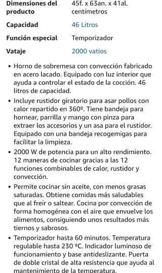 Horno de sobremesa Cecotec . El horno funciona perfectamente. - Capacidad de 46 L. Mírate bien las fotos,los indicadores de los botones están algo borrosos por el uso y limpieza