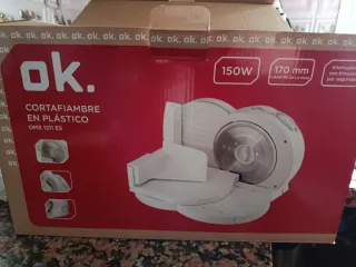 Cortafiambre de la marca OK., modelo OMS 1211 ES, en color blanco. Usada en 2 ocaciones ya que se compró para pasar un fin de semana en el campo con los amigos. No se a usado mas - Potencia: 150W. - Diámetro de la hoja: 170 mm. - Interruptor con bloqueo de seguridad.
