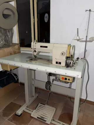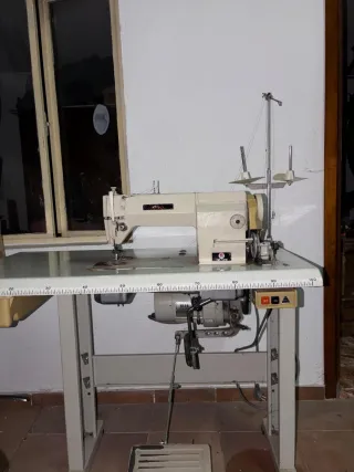 Máquina de coser industrial Alfa, ideal para trabajos de costura. - Mesa de trabajo amplia con guías. - Pedal de control. - Soporte para hilos.