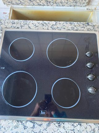 Vitrocerámica Teka de 5800W. Diseño moderno y elegante para tu cocina. - Cuatro zonas de cocción. - Mandos giratorios. - Superficie de cristal negro. - Sin ralladuras, como se ve en las fotos. - Montada en la piedra de granito que se puede ver. - Se vende por reforma de cocina.