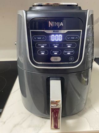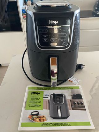 Freidora de aire Ninja Air Fryer Max en color negro. Incluye guía rápida y de recetas. Capacidad de 5.2 L - Panel de control digital con funciones preestablecidas. Funciones :Max Crisp, Air Fry, Roast, Bake, Reheat, Dehydrate. - Botón Start/Stop y encendido/apagado. - Asa cromada para extracción de la cesta. - Cesta extraíble para facilitar la limpieza.