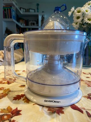Exprimidor eléctrico SilverCrest con diseño transparente y asa. - Base blanca. - Jarra de plástico. - Cono exprimidor.