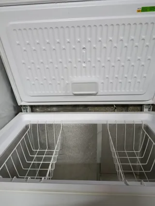 Arcón congelador de gran capacidad con unas medidas de 1 metro de largo por 0.90 metros de alto. - Color blanco. - Puerta abatible. - Interior con rejilla divisoria.