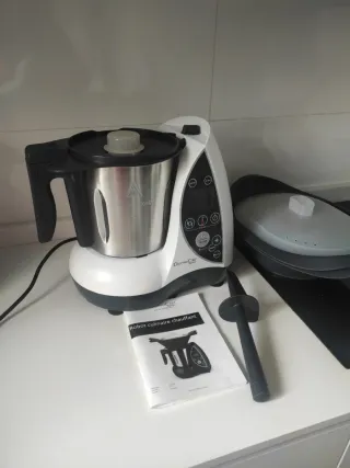 Robot de cocina DomoClip Premium en color blanco y negro. Incluye manual de instrucciones. - Jarra de acero inoxidable. - Panel de control digital. - Asa ergonómica. - Todos los complementos (castillo, mariposa, vaporera...) - Funciona perfectamente, se vende por qué hemos hecho upgrade estás navidades - Como un termomix o Mounsier cousine pero más barato - No puede picar como un puré fino, hasta aque no baja la temperatura de 55° - Tamaño Max del vaso 2 litros