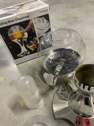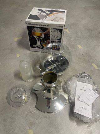 Dispensador de cerveza con enfriador incorporado. Ideal para mantener tu bebida fría. - Diseño transparente para ver el contenido. - Base plateada y detalles cromados. - Incluye tapa y compartimento para hielo.