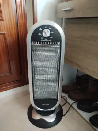 Calefactor eléctrico de pie con diseño vertical y base redonda. - Color plateado y negro. - Rejilla protectora frontal. - Selector de potencia con varias posiciones.