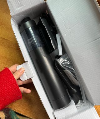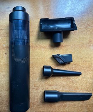 Aspirador compacto de color negro, diseñado para la limpieza del coche. Incluye varios accesorios para facilitar su uso. - Diseño cilíndrico. - Varias cabezas (larga, cepillo, plana...) - Depósito transparente. - Incluye cable de carga.