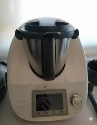 Robot de cocina Thermomix de la marca Vorwerk. Un ayudante versátil para tu cocina. - Diseño en color blanco y acero inoxidable. - Panel de control con diales. - Asa ergonómica para un fácil manejo. - Lleva los accesorios de la foto. La temperatura no funciona muy bien, calienta, pero no funciona muy bien el termostato.