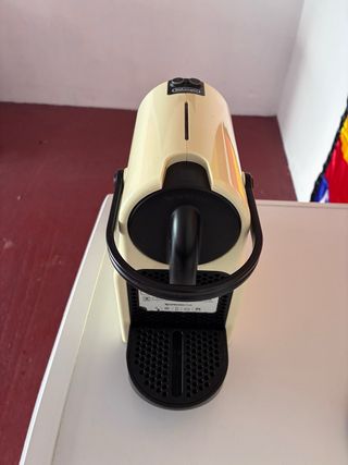 Cafetera Nespresso DeLonghi en color beige. Diseño compacto y elegante. Palanca superior larga para cerrar la cápsula • Depósito de agua trasero transparente • Base ovalada con rejilla • Tamaño muy compacto - Marca: Nespresso DeLonghi - Color: Beige - Modelo: [No especificado] - Incluye bandeja recogegotas.