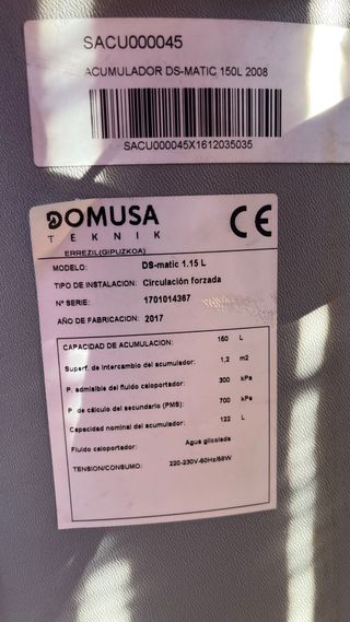 Calentador de agua DOMUSA DS-MATIC 1.15L. Sistema solar para producción de agua caliente sanitaria - Modelo: DS-MATIC 1.15L - Capacidad: 150 litros - Marca: DOMUSA TEKNIK - Placa Termosolar incluida Vendo por cambiar a Aerotermia