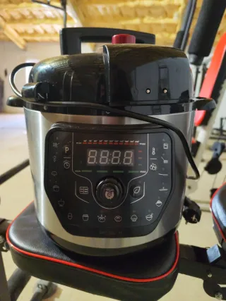 Olla programable Cecotec, modelo GM H. Cuenta con pantalla digital y varios programas. - Panel de control con pantalla digital. - Botón giratorio para selección de programas. - Indicadores luminosos de temperatura.