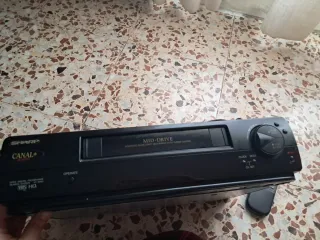 Reproductor de vídeo VHS de la marca Sharp, modelo CANAL+ VHS HQ. Se encuentra en buen estado y funciona correctamente. - Incluye mando a distancia. - Incluye cable Euroconector.