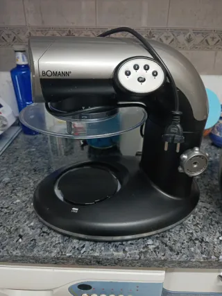 Amasadora de la marca Bomann con un diseño moderno y funcional. - Cuerpo principal en color gris metalizado y negro. - Panel de control con 4 velocidades y función OFF. - Base redonda y estable con indicador de bloqueo. - Vaso de acero inoxidable.