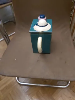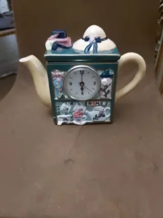 Original cafetera decorativa con un reloj integrado en su diseño. - Tapa con sombreros. - Diseño frontal con escenas y flores. - Asa y pico en color crema.