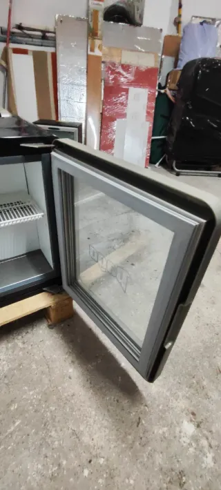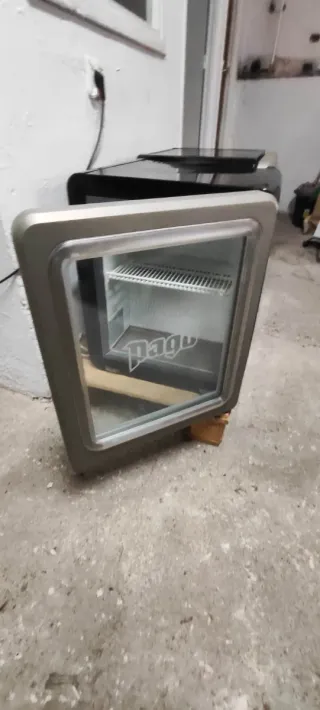 Nevera pequeña con puerta de cristal transparente. Ideal para bebidas o como mini bar. - Diseño moderno. - Puerta con marco plateado. Funciona perfectamente, enfría muy bien, bien cuidada no ha tenido mucho uso. Usado solo épocas de verano. 47 anchox45fondox55alto Tiene luz por dentro