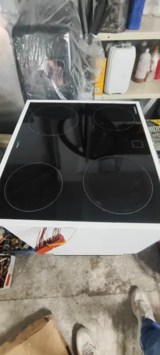 Placa vitrocerámica con cuatro zonas de cocción. - Superficie de cristal negro. - Marco blanco. - Diseño moderno. 57x50cm exterior 55x48 interior