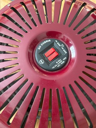 Brasero eléctrico de color burdeos con rejilla protectora. - Potencia: 300W - 400W. - Voltaje: 220-240V. - Indicador NO CUBRIR. - Diseño circular. Nuevo