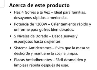 TODOS NUESTROS PRODUCTOS SON COMPLETAMENTE NUEVOS Y CON DESCUENTOS BRUTALES. IMPORTANTE: 1. Precio Fijo no negociable. No respondemos a mensajes de regateo. 2. No comunicamos fuera de la plataforma: no pidan eMail o teléfono. DESCRIPCION COMPLETA EN LA SEGUNDA IMÁGEN Yabano Gofrera Belga 4 Porciones – Gofrera Eléctrica 1200W con 5 Niveles de Dorado, Placas Antiadherentes, Sistema Antiderrames y Luces Indicadoras - Placas antiadherentes. - Indicador luminoso de encendido y listo. - Control de temperatura ajustable.
