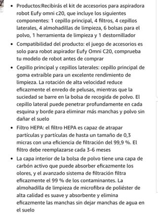 TODOS NUESTROS PRODUCTOS SON COMPLETAMENTE NUEVOS Y CON DESCUENTOS BRUTALES. IMPORTANTE: 1. Precio Fijo no negociable. No respondemos a mensajes de regateo. 2. No comunicamos fuera de la plataforma: no pidan eMail o teléfono. DESCRIPCION COMPLETA EN LA SEGUNDA IMÁGEN MAOOY Juego de accesorios para robot aspirador Eufy Omni C20, 1 cepillo de rodillo, 4 filtros, 4 almohadillas de limpieza, 4 cepillos laterales, 6 bolsas de polvo, 1 destornillador, 1 cepillo de limpieza - Cepillo principal - 4 filtros - 4 bolsas de polvo - 4 paños de mopa - 3 cepillos laterales - Herramienta de limpieza - Destornillador