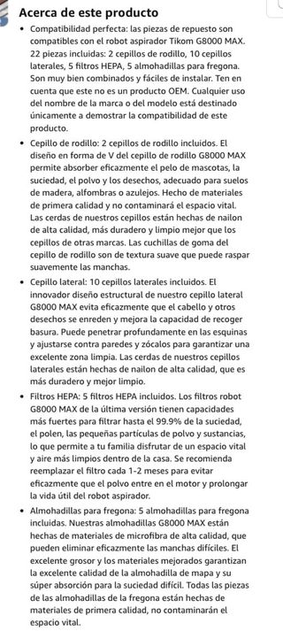 TODOS NUESTROS PRODUCTOS SON COMPLETAMENTE NUEVOS Y CON DESCUENTOS BRUTALES. IMPORTANTE: 1. Precio Fijo no negociable. No respondemos a mensajes de regateo. 2. No comunicamos fuera de la plataforma: no pidan eMail o teléfono. DESCRIPCION COMPLETA EN LA SEGUNDA IMÁGEN BRUVISH (27 piezas) Para Lefant M3 Kit de accesorios de repuesto para aspiradora robot Lefant M3, 1 cepillo giratorio, 8 cepillos laterales, 7 bolsas para polvo, 7 filtros HEPA con filtros de espuma y 4 mopas - Incluye 1 cepillo principal. - Incluye 8 cepillos laterales. - Incluye 4 paños de mopa. - Incluye 6 bolsas para el polvo. - Incluye 8 filtros.