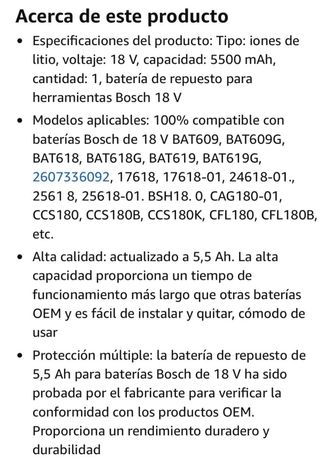 TODOS NUESTROS PRODUCTOS SON COMPLETAMENTE NUEVOS Y CON DESCUENTOS BRUTALES. IMPORTANTE: 1. Precio Fijo no negociable. No respondemos a mensajes de regateo. 2. No comunicamos fuera de la plataforma: no pidan eMail o teléfono. DESCRIPCION COMPLETA EN LA SEGUNDA IMÁGEN LONG FIT Batería de repuesto para Bosch BAT609 BAT622 BAT609G BAT618G BAT619 BAT619G BAT619G BAT610G BAT618 para todas las herramientas de batería de litio de 18 V - Voltaje: 18 Volt - Capacidad: 5.5Ah - Tecnología: Li-Ion