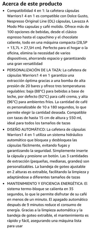 TODOS NUESTROS PRODUCTOS SON COMPLETAMENTE NUEVOS Y CON DESCUENTOS BRUTALES. IMPORTANTE: 1. Precio Fijo no negociable. No respondemos a mensajes de regateo. 2. No comunicamos fuera de la plataforma: no pidan eMail o teléfono. DESCRIPCION COMPLETA EN LA SEGUNDA IMÁGEN CAPXSNOB Warriors1 Cafetera Cápsula 4 en 1 para Nespresso OL, Dolce Gusto, Lavazza A Modo Mio y Café Molido, 20 bars, 0,82 L, 3 niveles de Temperatura y 3 tamaños de Taza Programables, Máquina Multicapsulas - Compatible con cápsulas Nespresso. - Diseño moderno y compacto.