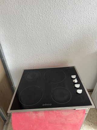 Placa de vitrocerámica de la marca Edesa con cuatro zonas de cocción. - Diseño moderno en color negro. - Mandos giratorios para control de temperatura. - Indicadores luminosos de calor residual.