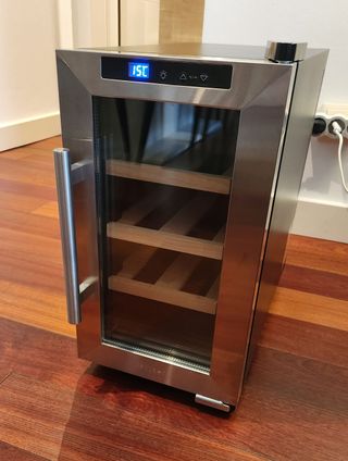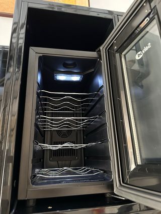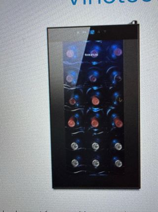 Vinoteca de la marca Eurotec con puerta de cristal. Capacidad para 8 botellas. Funciona perfectamente pero el display de la temperatura no marca bien la totalidad de los números. Por eso la pongo a ese precio. Pero funciona y enfría perfectamente, así como enciende y apaga la luz integrada perfecto también. - Diseño moderno. - Acabado en aluminio y cristal negro. - Panel de control digital.