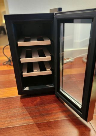 Vinoteca Saivod con capacidad para 6 botellas. Pesa muy poco. Ligero toque arriba como se me en la imagen. No afecta a funcionamiento. - Diseño moderno en color negro. - Puerta de cristal. - Panel de control digital.