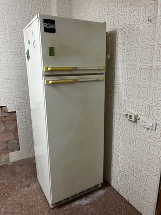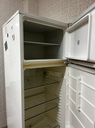 Nevera blanca de dos puertas, con una altura aproximada de 1,60 a 1,65 metros. - Diseño clásico en color blanco. - Tiradores en color dorado.