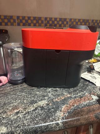 Cafetera Nespresso Krups en color rojo y negro. El depósito de cápsulas usado está separado. - Diseño moderno. - Marca Nespresso. - Modelo Krups.