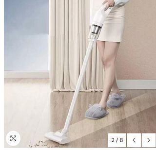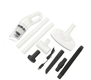 Aspiradora portátil de color blanco con varios accesorios para una limpieza versátil. - Incluye cargador USB. - Boquilla estrecha. - Cepillo. - Tubos extensores. - Cabezal de suelo. - Manguera flexible.