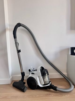 Usado un par de veces, en estado perfecto, como nuevo. Aspirador sin bolsa de la marca Bosch. Utiliza tecnología AirClean || para una limpieza eficiente. Funciona con alimentación de red y tiene una potencia de 700 W. El nivel de ruido es de 78 dB. Diseñado para suelos duros, incluye boquilla combi, cepillo universal y cepillo para suelos duros. La longitud del cable es de 9 metros, lo que permite un amplio radio de acción. Su diseño ligero facilita el movimiento y almacenamiento. Incluye un sistema de filtro higiénico que elimina hasta el 99 % de partículas finas, bacterias y alérgenos. Medidas (anchoxaltoxfondo) 26,8 x 31,4 x 38