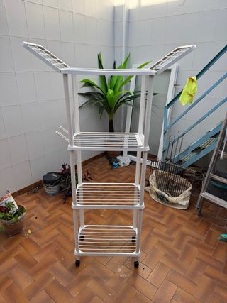 Tendedero vertical de plástico blanco con ruedas. - Estructura de cuatro niveles. - Alas laterales abatibles. - Ruedas para fácil movilidad.