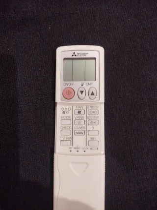 Mando a distancia para aire acondicionado Mitsubishi Electric. Funciona con pilas. - Botones de ON/OFF, TEMP, FAN, MODE, VANE, CHECK, TEST RUN. - Pantalla LCD. - Incluye AUTO STOP y AUTO START.