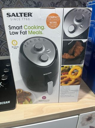 Freidora de aire Salter, ideal para comidas saludables y bajas en grasa. Su diseño compacto la hace perfecta para cualquier cocina. - Capacidad de 2 litros. - Temporizador de 30 minutos. - Cesta de cocción extraíble con recubrimiento antiadherente. - Control de temperatura ajustable. - Apagado automático. - Incluye recetas online.