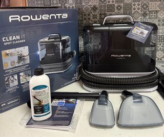 Aspirador limpiador de manchas Rowenta Clean It. Incluye varios accesorios para una limpieza profunda. Rowenta Clean It, Aspirador de tapicerías, Depósito extraíble de 1,8L de agua limpia y 1,5L de agua residual, Limpieza rápida de derrames y manchas, Potencia de 400 W, Compacto y portátil. - Modelo: Clean It - Marca: Rowenta - Incluye botella de limpiador original. - Accesorios para diferentes superficies. En perfecto estado. 📦 Conserva su caja original.