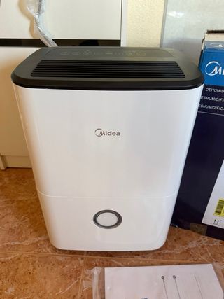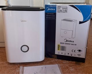 Deshumidificador Midea en color blanco y negro. El modelo es MDDF-20DEN7-QA3-W. ✅ NUEVO ✅ - Diseño moderno y compacto. - Panel de control intuitivo. - Indicador de nivel de agua. 📦 Conserva su caja original.