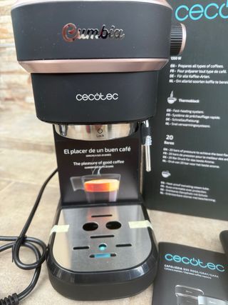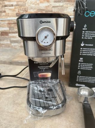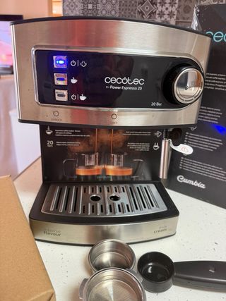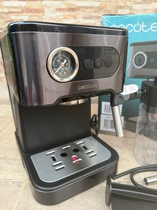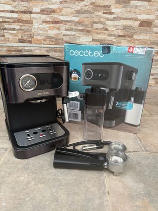 NO NEGOCIABLE Cafetera espresso Cecotec Power Espresso 20. - Color plateado y negro. - Incluye portafiltros y accesorio para espumar leche. - Manual de instrucciones.