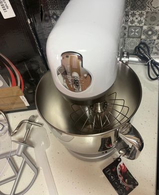 Amasadora Kenwood kMix en color blanco frío. Incluye accesorios. - Diseño elegante y funcional. - Bol de acero inoxidable. - Accesorios para mezclar y amasar.